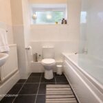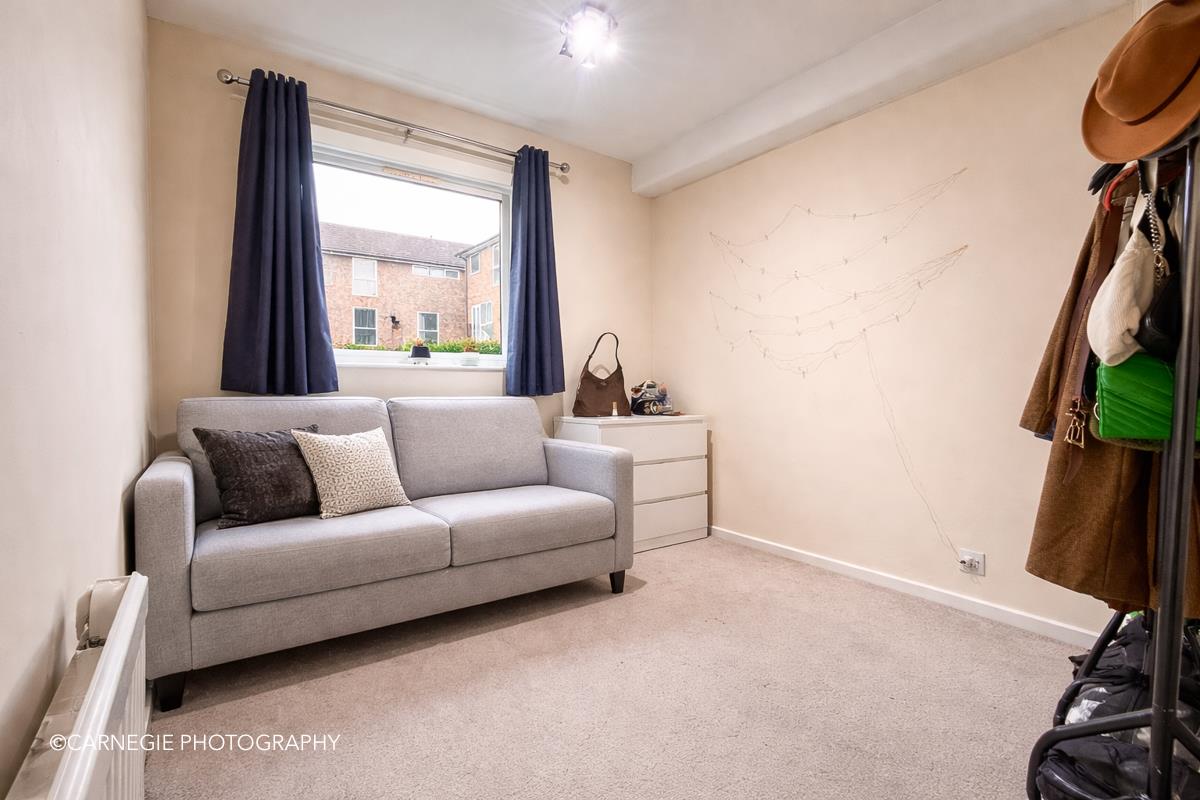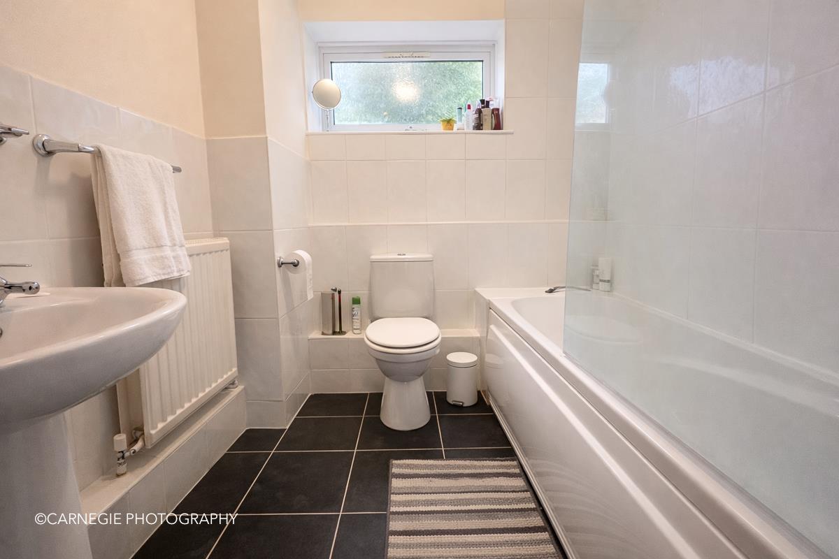 There are two well-proportioned bedrooms, both tastefully presented and offering ample space for bedroom furniture. The main bedroom enjoys a peaceful outlook, while the second bedroom is ideal as a guest room, home office or nursery. A modern bathroom completes the accommodation, fitted with a white suite including bath with shower over.