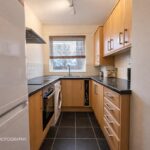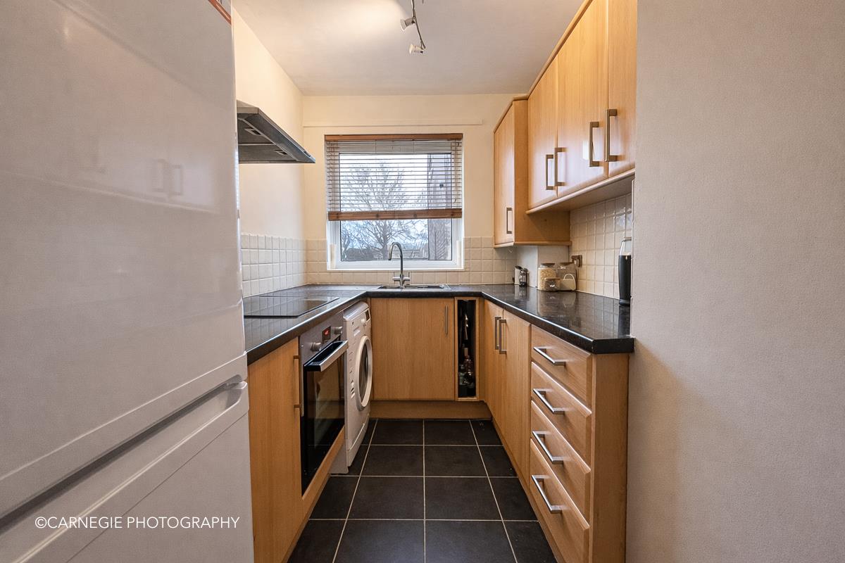The kitchen is neatly arranged and well equipped with a range of fitted units, work surfaces and integrated appliances, making good use of the available space and featuring a window to the front.