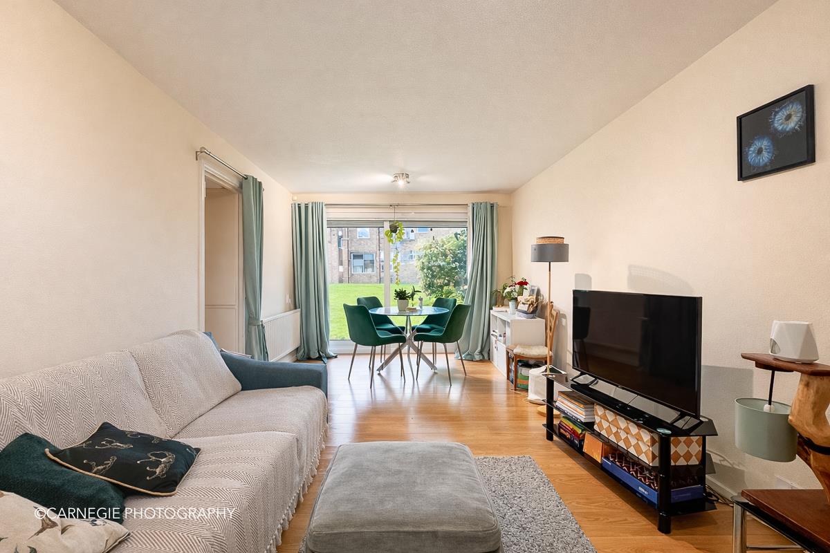 The property is entered via a welcoming entrance hall with useful storage cupboards, leading through to a spacious lounge/dining room. This impressive living space comfortably accommodates both seating and dining areas and benefits from excellent natural light. A patio door opens directly onto a decked seating area, providing a pleasant and private outdoor space ideal for relaxing or entertaining, with easy access to surrounding communal grounds.